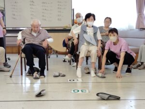 本日の行事は、数年ぶりにバージョンアップして大復活! スリッパ飛ばしを行いました。 ルールは簡単! 椅子に座ったまま、スリッパを飛ばして、得点を競います。 ...>>続きを読む