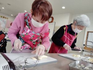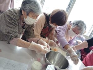 ハンドミキサーが少し重たいので、職員と一緒に行いました!