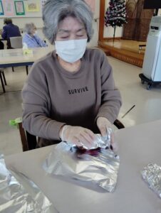 焼き芋大会の日は、午前中にアルミホイルを巻くことから始めます。