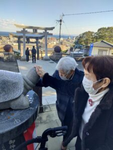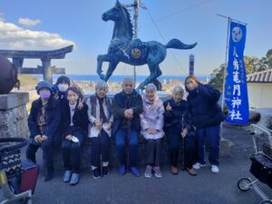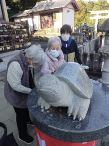 2026年1月10日 ケアハウス ⛩️ケアハウス初詣⛩️ 新年になり初詣に行ってきました⛩️ 毎年恒例の内竈神社です🐢🐢 亀の像を触ってお願いしているところです 可愛いですね お参り後には、おみくじをして記念撮影しました👏👏 午年だけに馬の像の前に記念撮影です📷📷 また来年も皆さんで来れると嬉しいですね😄 デイサービスより、新年のご挨拶🎍 初詣(内竈神社)