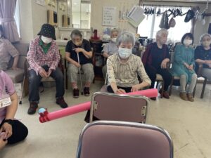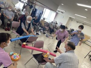 2025年7月8日 デイサービス 新企画(^^♪ 本日の行事は新企画のゲーム(飛んでけピンポン)をしました。 初めてのゲームだったがとても盛り上がり、皆さま楽しかったと言われていました(≧▽≦) 皆で頭の体操 風船引っ張りゲーム🎈