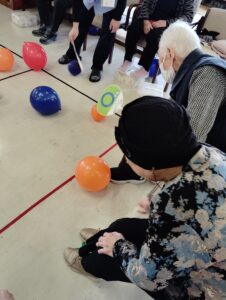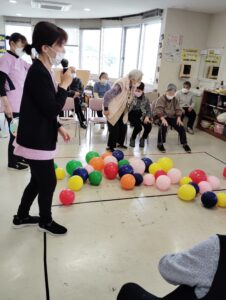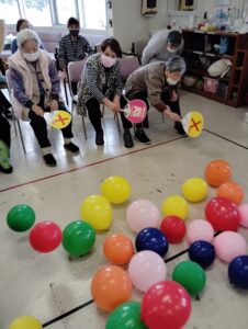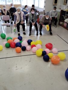2025年4月2日 デイサービス 新企画、風船陣地取りゲーム🎈 新企画の風船陣地取りゲームをしました(^^♪ 皆さん初めての行事で戸惑いながらの参加でしたが、楽しんでいただけました。 ルールはシンプルで、うちわで仰いで自分の陣地が相手陣地より少なければ勝ちというゲームです。 4月の白板 👵100歳祝いの会🎊