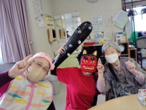 2026年2月3日 デイサービス 節分~豆まき( `ー´)ノ 2月2日(月)・3日(火)は 節分ということで、豆まきをしました!! 今日は、豆まきの様子をご紹介したいと思います。 職員が扮する鬼に向かって、豆をまいているところです(*^-^*) 鬼との対決を楽しまれています!「鬼はそと~!!」 鬼をやっつけたあとは、「福はうち~!!」と お菓子まきをしました! 最後は仲良く記念撮影です📸 皆さんに福が舞い込んで、健康に過ごせますように☆彡 1月誕生会💐 🍴2月食事会🐟