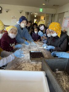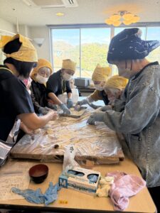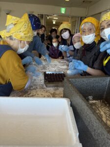 餅つきの後は、皆様でお餅を丸めて、あんこやきな粉をまぶして仕上げました。